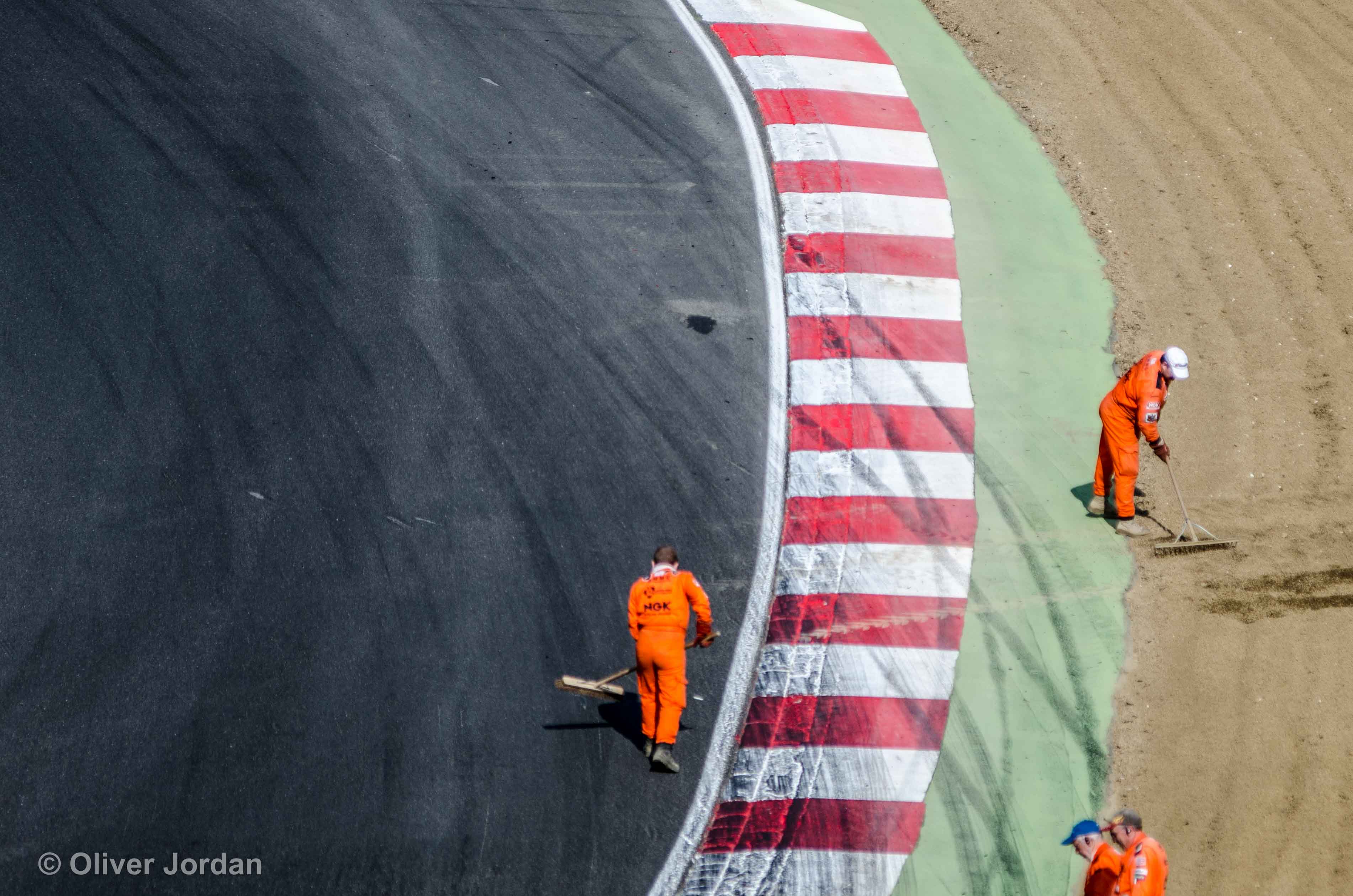 For the second BTCC race of the day, we headed over a bridge to the inside of Druids Corner. Marshals covered the track making sure there wasn’t any debris from the earlier races and raking the gravel flat.
